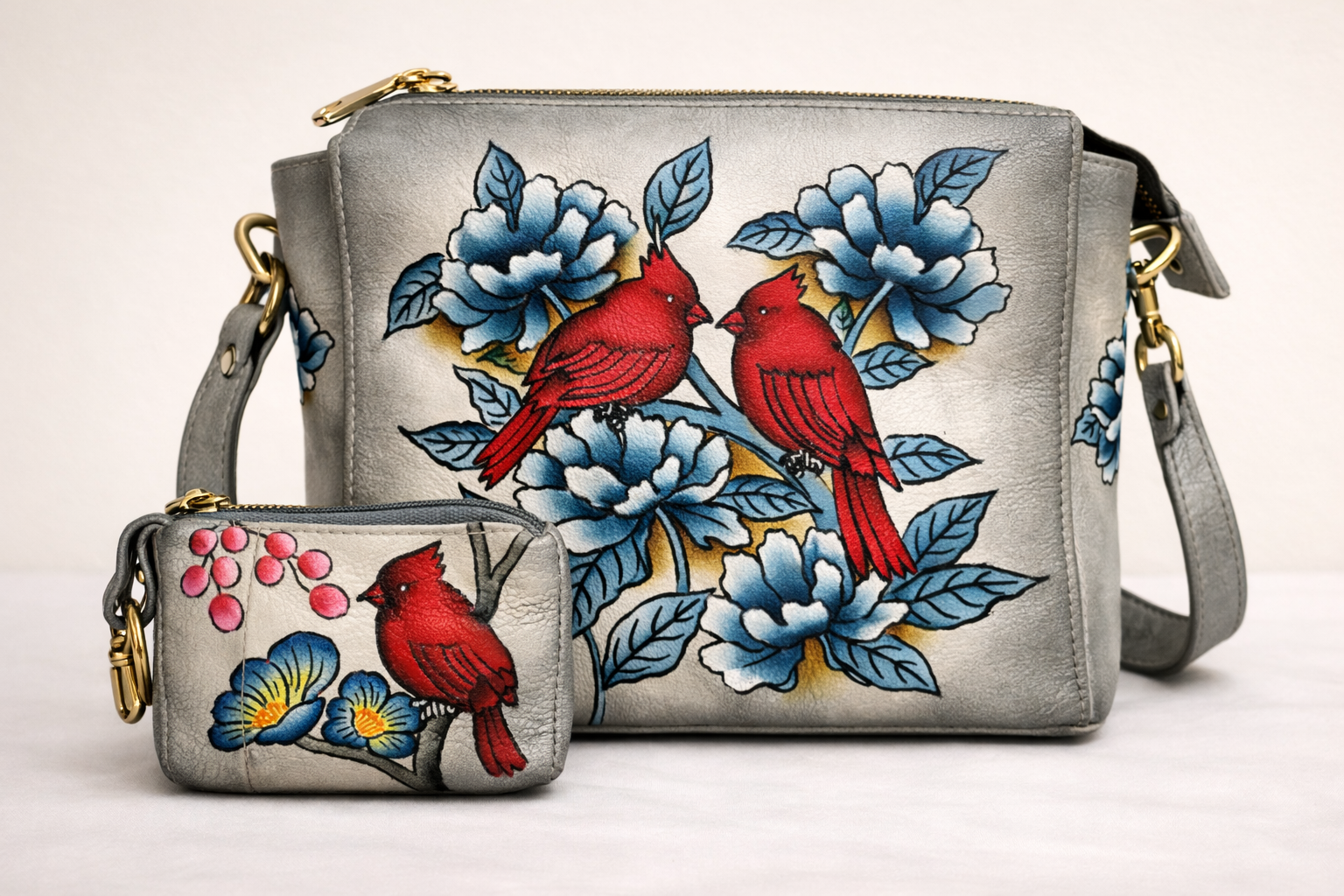 Discover the elegance of traditional Shantiniketan folk art with this hand-painted genuine leather sling bag, featuring a striking composition of red birds nestled among blooming floral motifs. Each element is meticulously hand-painted, ensuring that every piece is truly unique and rich in artistic character.