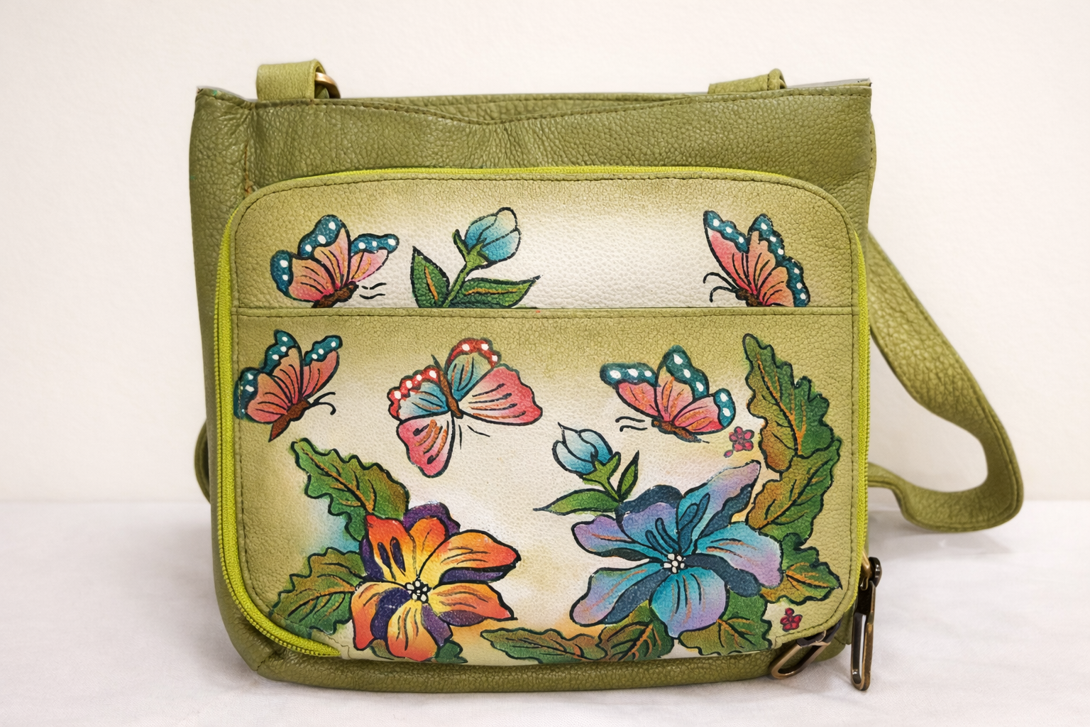 Shantiniketan Hand-Painted Genuine Leather Sling Bag – Olive Green Floral Butterfly Art